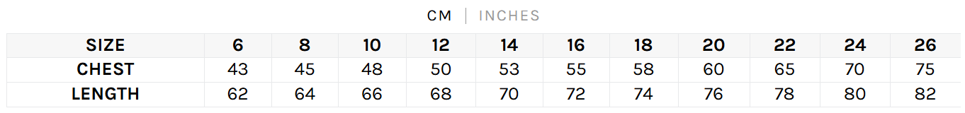 The chart below shows the 1/2 chest measurement. Please allow variation +/- 1cm