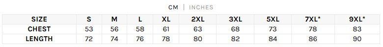 The chart below shows the 1/2 chest measurement. Please allow variation +/- 1cm