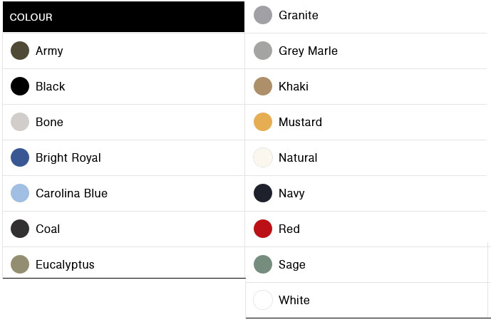 Available Colours: White, Black, Army, Bone, Coal, Grey Marle, Natural, Navy, Pale Pink, Red, Sage