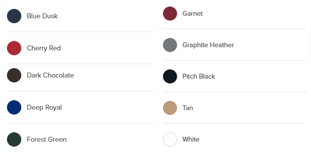 Available Colour: Blue Dusk. Cherry Red, Dark Chocolate, Deep Royal, Forrest Green,Garnet, Graphite heather, Pitch Black, Tan and White.