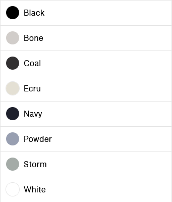 Colours Available: WHITE, NAVY, BLACK, Ecru, Storm, Powder, Coal, Bone.