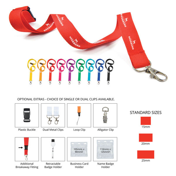 Optional fittings (Dual metal clips, Alligator clip/s, plastic buckle and name badge holder available at additional cost).
