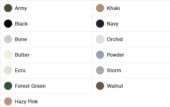 Colours: Army, Black, Navy, White, Ecru, Bone, Butter, Hazzy Pink, Khaki, Walnut, Orchid, Forrest Green, Powder, Storm