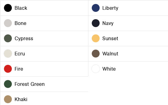 Colours: White, Black, Ecru, Bone, Sunset, Fire, Khaki, Walnut, Cypress, Forrest Green, Liberty, Navy