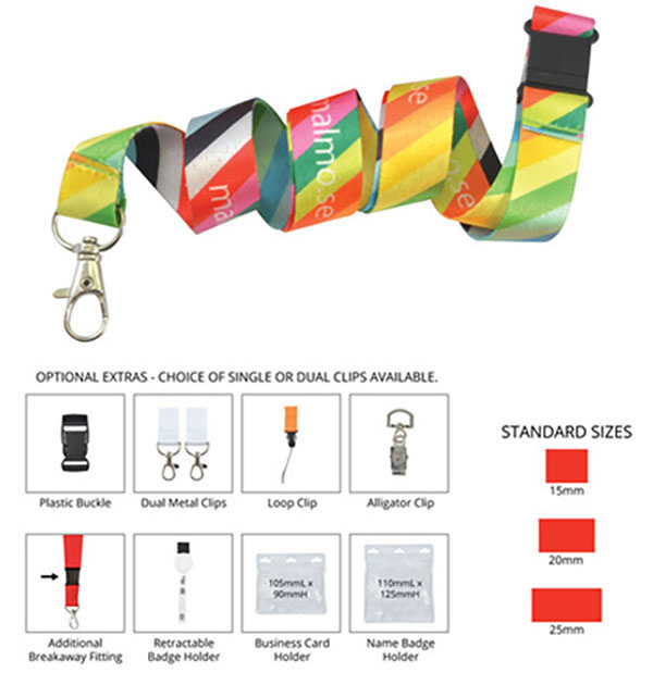 Optional fittings (Dual metal clips, Alligator clip/s, plastic buckle and name badge holder available at additional cost).